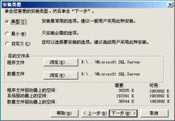 第十步:其中有两部分选项,安装类型:有典型、最小、自定义安装方式,一般选择典型安装。安装路径:设置SQL Server 2000的程序
