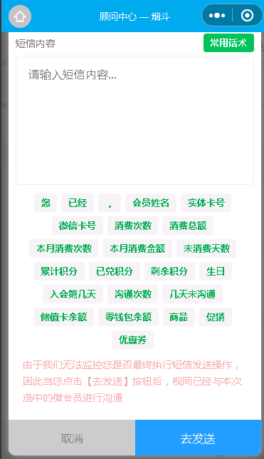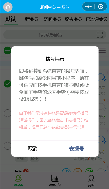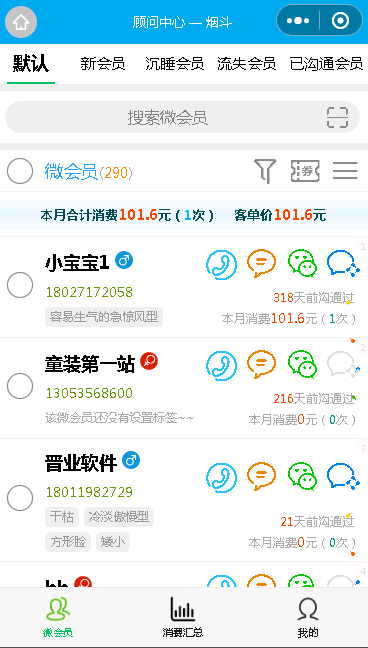 六、微顾问在顾问中心针对自己负责的会员发起一对一的实时沟通,沟通方式包括电话、短信、公众号聊天、企业微信聊天等