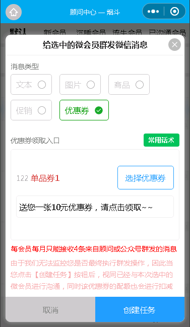 七、微顾问根据沟通结果,主动给会员推送专属优惠券,刺激会员到店消费