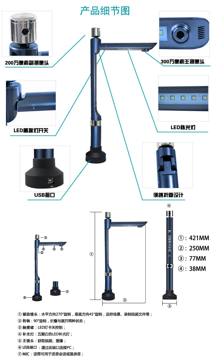 主摄像头300万高清像素,分辨率可调;副摄像头200万像素,采用广角镜头,可水平360°和上下45°旋转,灵活调整拍摄角度,进行无死角拍摄;